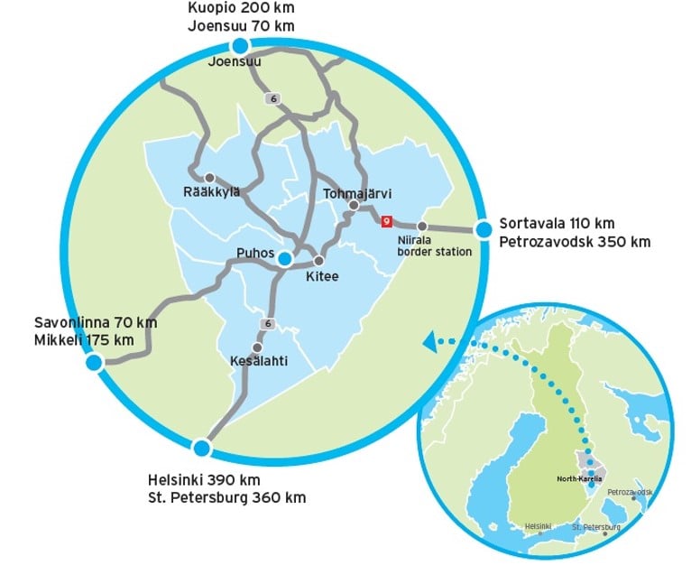 In addi­tion to Kitee, the eco­nom­ic area of the Kitee region includes Rääkkylä and Tohma­järvi. This region has approx­i­mate­ly 16,000 inhab­i­tants, of which around 9,300 live in Kitee.